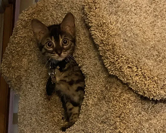 Her Dad has always wanted a bengal. We had to say goodbye to her older sister mid-March, pre-pandemic. When the pandemic hit and cancelled all of our plans her Dad, Ed, came across an adorable kitten on Facebook in a begal group. When he shared the picture with Mom, she knew that cute little kitten was meant to be in our family forever. We flew to Tampa, Florida to bring her home at the end of May.