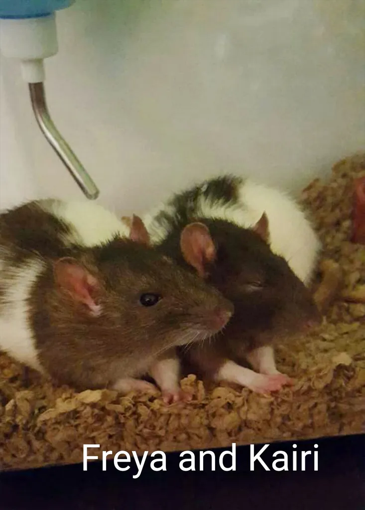 “For a little less than a year, Kayla and I were the loving mothers to Freya and Kairi. They were our babies, and they were the sweetest, most loving critters I have known in a long time. About three months ago, we noticed a small lump on Kairi, so we brought her into the vet. Little did we know, even with the surgery, that was the beginning of the end. She made a full, amazing recovery, but about a month later, we found a new lump on Kairi and the first on Freya. We brought them home and made the last month the best we could for our girls. Rest in Peace, Freya and Kairi. We’ll see you over the rainbow bridge some day.”