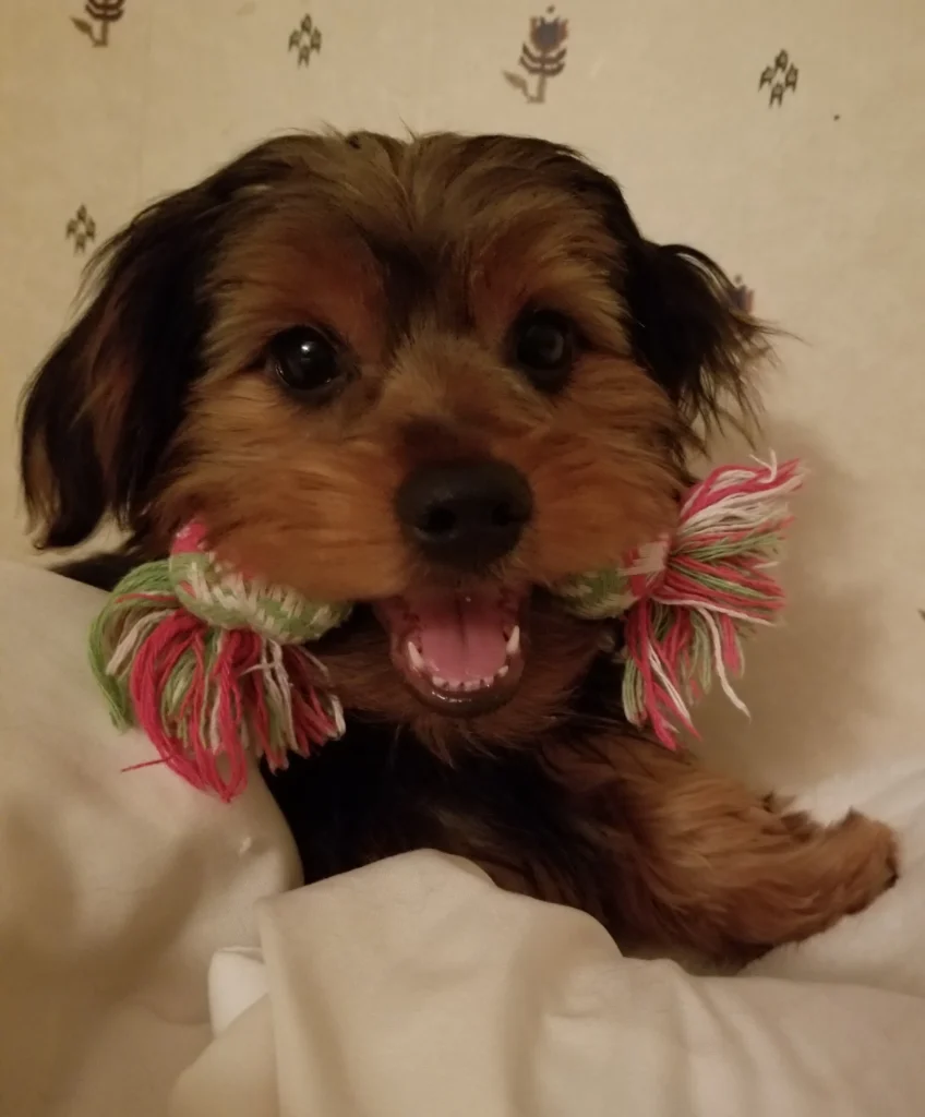 Really wanted a playmate for my female Yorkie. Started looking around and was so lucky to find this cute snuggly little guy as a puppy.