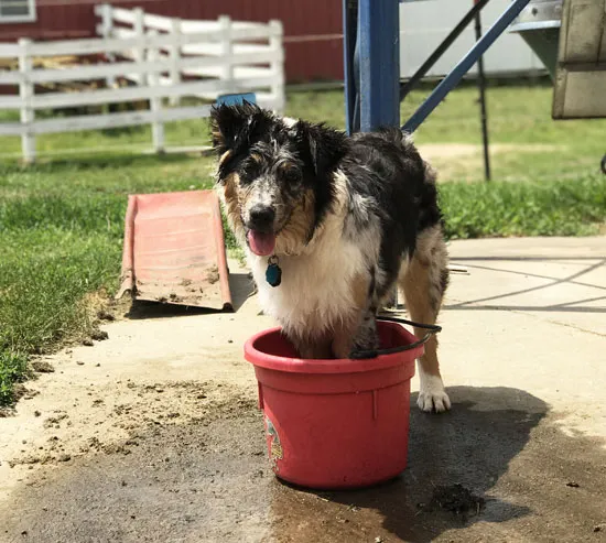 I work on a dairy farm and Davina comes with me to work everyday. I am hoping to teach her to be a herding dog. But her current job is herding all of the kittens we have and keeping them safe.
